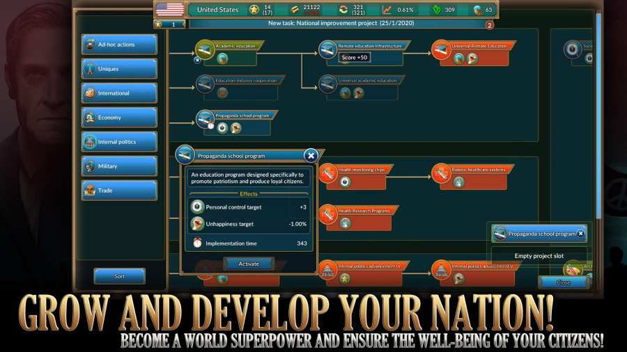 3、发展壮大你的国家在全球排名图表的经济实力,科技竞争力和军事霸权的最高级别。你是否成为联合国的一个重要成员,或核暴君,欺负你周围的人都是你的选择。