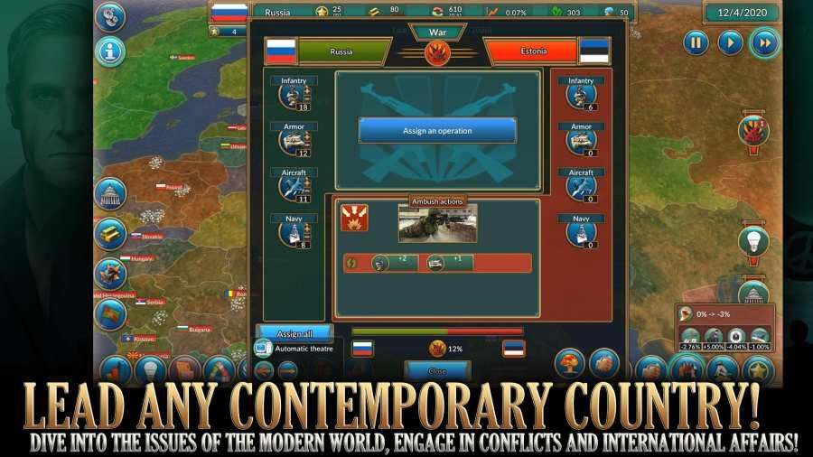 1、深入到现代世界的问题,使用国家力量和经济实力解决军事冲突和国际事务。选择你取得自己与其他国家的利益,学会应对突发事件,全球性威胁和各种危机的方法。尝试欧盟,恐怖主义,第三次世界大战和许多其他真实和虚构的场景发生后的处理办法。