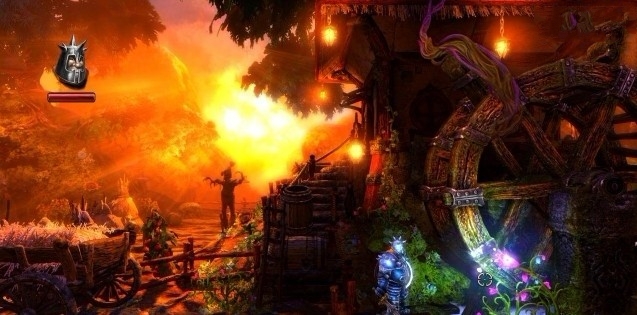 來(lái)到水車(chē)這里可以看到上邊有個(gè)植物卡住了,把左邊的車(chē)子推過(guò)來(lái),踩上去跳起來(lái)砍掉植物,