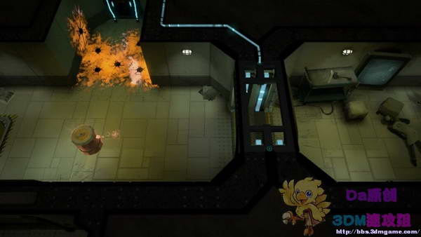 把左邊的電源桶安好。(如上圖)在進入門旁邊的桶,把木桶射走就可以秒掉這三個敵人