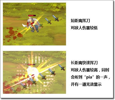 ★ 刀法:在游戲中可以使用鼠標(biāo)滑動攻擊敵人,在難度較高的時候比較講究刀法。正確使用的刀法應(yīng)講究快、準(zhǔn)、狠——也就是揮動的時候使勁一點,即可打出較高的傷害。當(dāng)屏幕上出現(xiàn)紅色的直線光效時傷害達(dá)到最大。