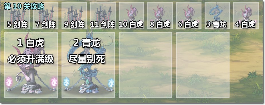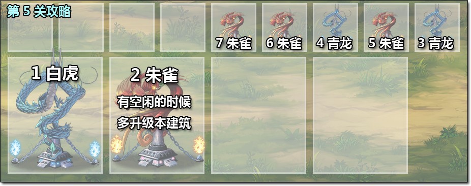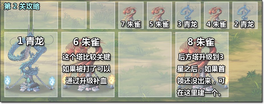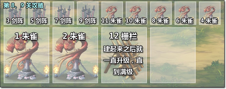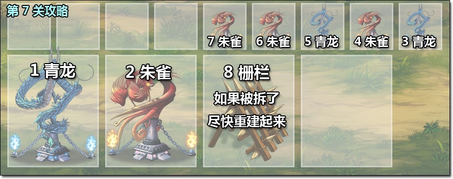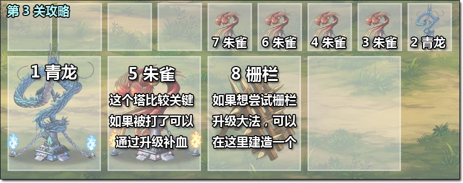 【戰(zhàn)術(shù)方法】比較輕松的一關(guān),后方建一個大的青龍,最前方建一個小青龍,然后布置大量朱雀即可?;旧辖ㄔ旌弥烊妇鸵呀?jīng)能較輕松過關(guān)了,如果有足夠的時間,可以嘗試“柵欄升級大法”。