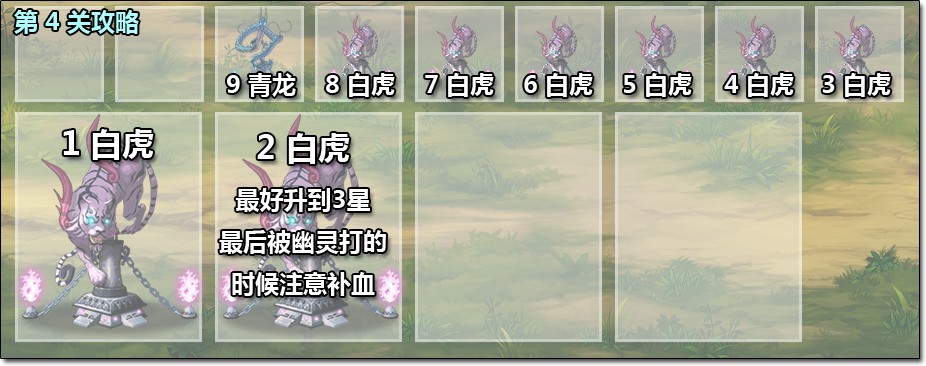 【戰(zhàn)術(shù)方法】三種攻擊主塔都已經(jīng)有了,很多種戰(zhàn)術(shù)都可以使用的一關(guān)。考慮到本關(guān)最后BOSS是單個不怕刀砍的幽靈,這里推薦白虎流:首先在后方建立兩個大的白虎,然后從前線開始一格一格擺滿小白虎,這時敵人已經(jīng)很難沖過來了(缺點是白虎的連擊數(shù)太低,很難打出1000連擊升級所有塔)。不斷升級將兩個大的白虎等級升到3星,再建一個小青龍給最后BOSS降低攻擊速度,最后BOSS來的時候給大白虎升級加血即可。