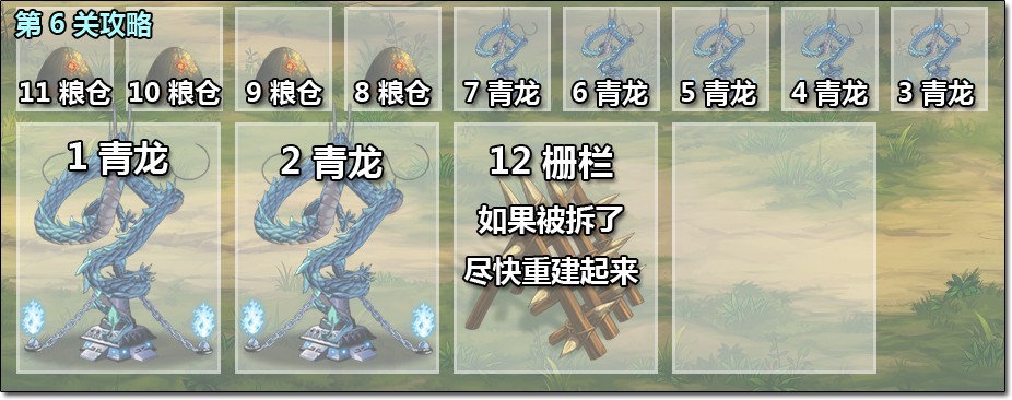 建造的時候,因為攻擊型的只有一個青龍,就只好多建青龍了,后方建造兩個,前方建造一排小青龍,所有夠不到敵人的地方全部建上糧倉(能加血,即使不加血也可以蹭點連擊數(shù))。在靠近前線的地方建造一個柵欄,雖然有后面一堆糧倉幫忙補(bǔ)血,但這個柵欄還是很有可能被干掉,如果被拆了,鼠標(biāo)左右鍵打出一塊空間來就趕緊把柵欄補(bǔ)回來。好在本關(guān)敵人人數(shù)不算太夸張,扛住就可以了。
