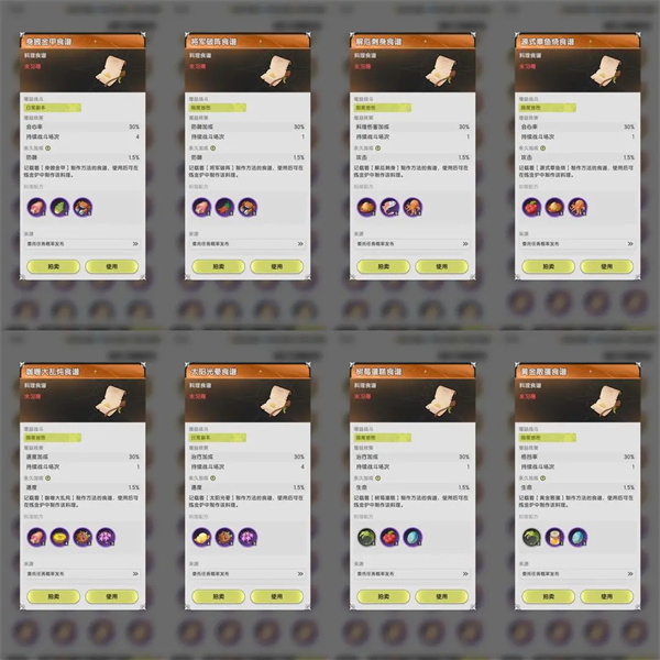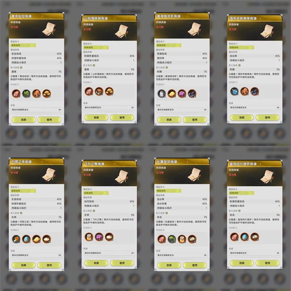 食譜按稀有度從高到低分為金、橙、紫、藍(lán)四種品質(zhì),不同品質(zhì)獲取方式和價(jià)格差異顯著。
