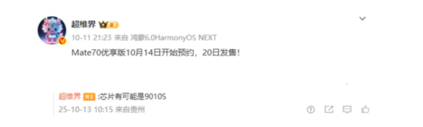 消息中提到,華為Mate70優(yōu)享版將在10月14日開啟預(yù)約,并于10月20日正式開售。